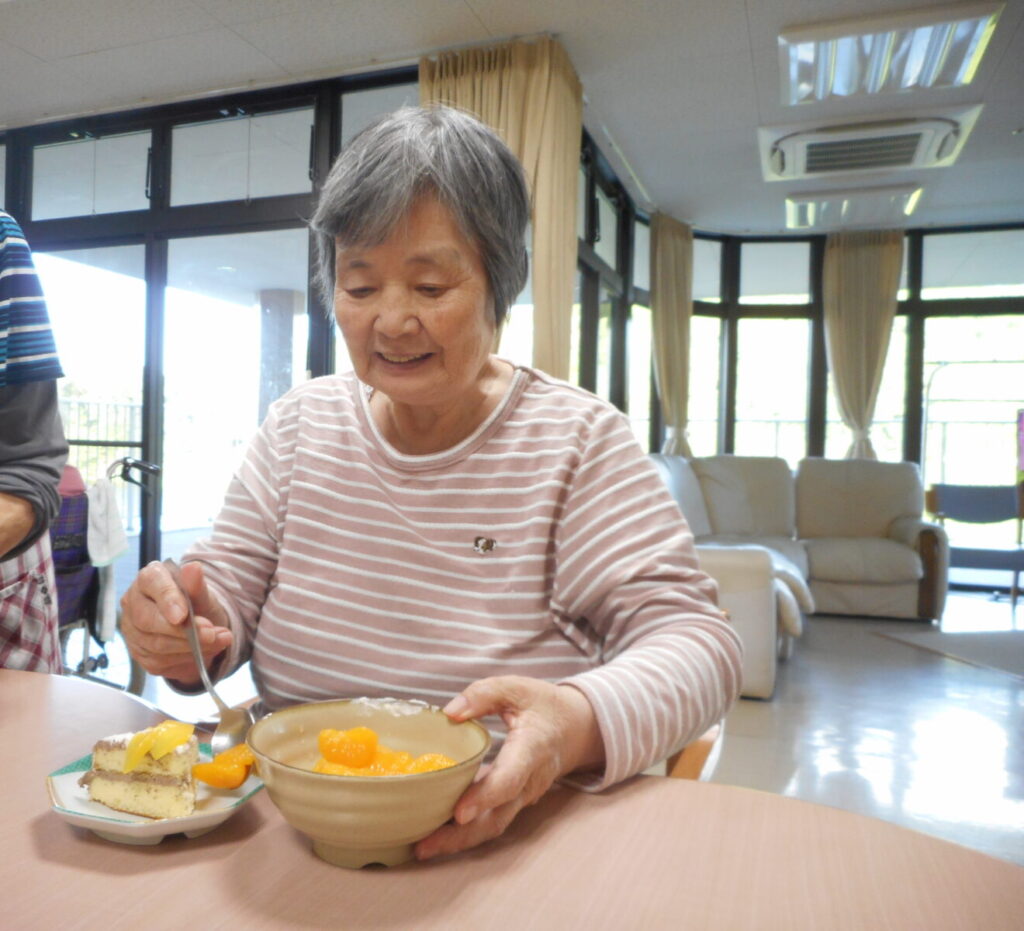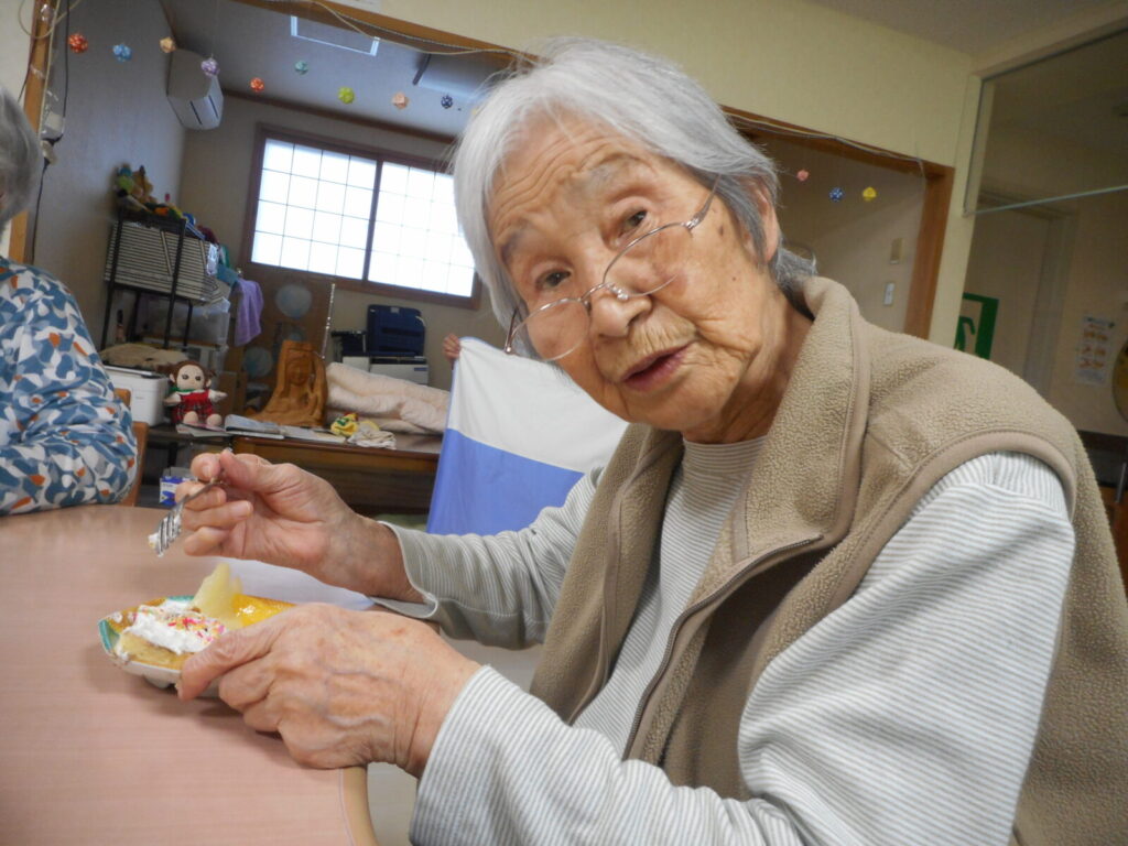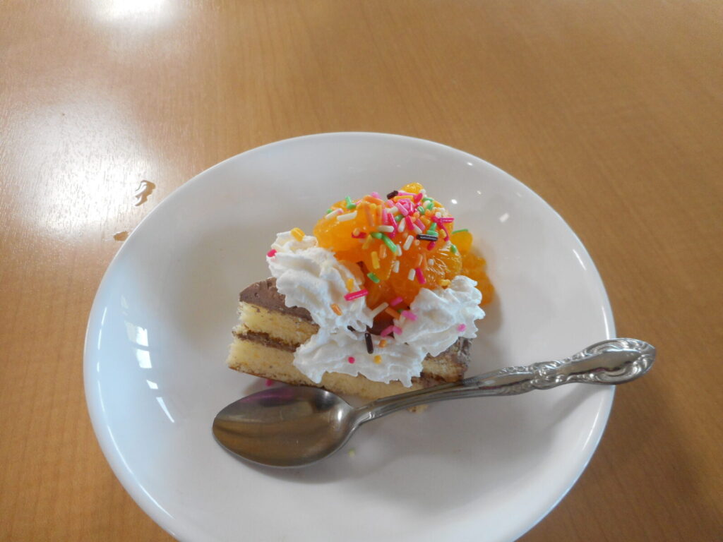 生クリーム・チョコレートクリームを選んでいただき、お好きなフルーツ缶詰とカラースプレーをトッピングしたオリジナルケーキと飲み物でお祝いをしました。