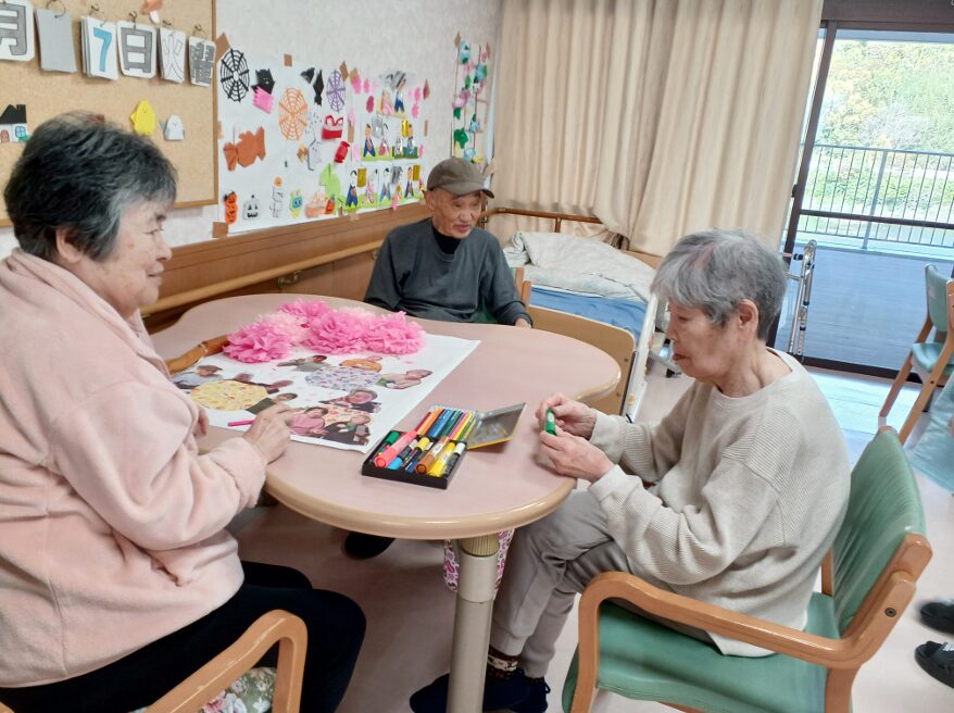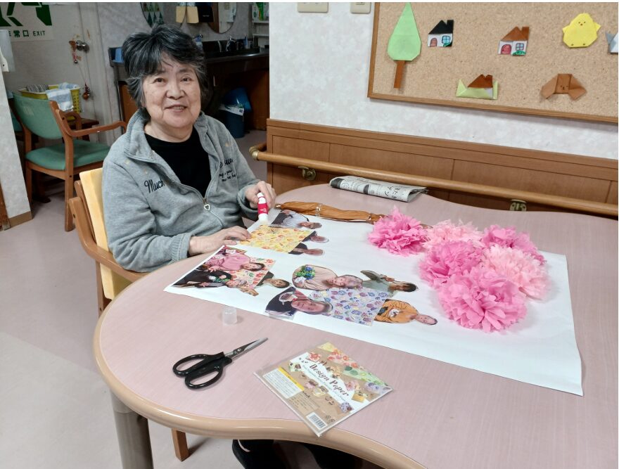 桜の花の思い出にと、利用者様と職員の写真も貼り付けて、桜の壁飾りを作りました。